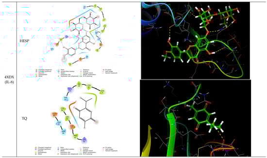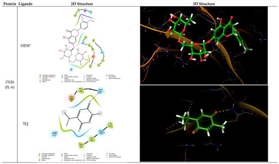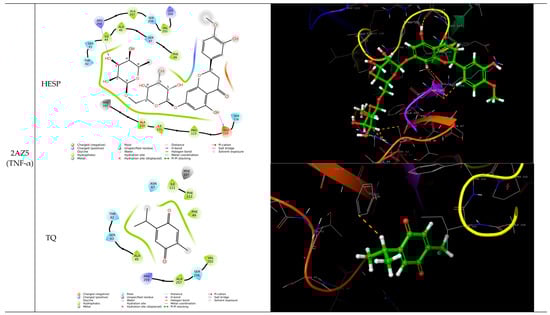 Detailed analysis of the results showed that HESP has better binding with target proteins than TQ. The docking scores and ligand interactions are tabulated in Table 1; 2D and 3D conformations are reported in Figure 1.