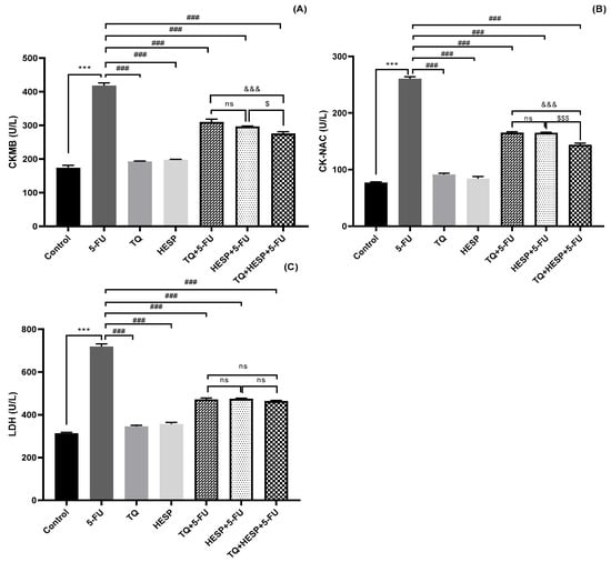 The effect of TQ, HESP, and 5-FU administration on the level of cardiac enzymes, and comparison of different groups with each other (one-way Anova followed by Tukey-Kramer multiple comparison test). (A) CKMB level; (B) CK-NAC level; (C) LDH level. All results are expressed as the mean ± SD. *** p < 0.001 vs. control group; ### p < 0.001 vs. 5-FU group; &&& p < 0.001 vs. TQ+5-FU group; $ p < 0.05, $$$ p < 0.001 vs. HESP+5-FU group. ns = non-significant; CKMB = creatinine kinase myoglobin binding; CK-NAC = N-acetyl-cysteine activated creatinine kinase; LDH = lactate dehydrogenase; TQ = Thymoquinone; HESP= Hesperidin; 5-FU = 5-Fluorouracil.