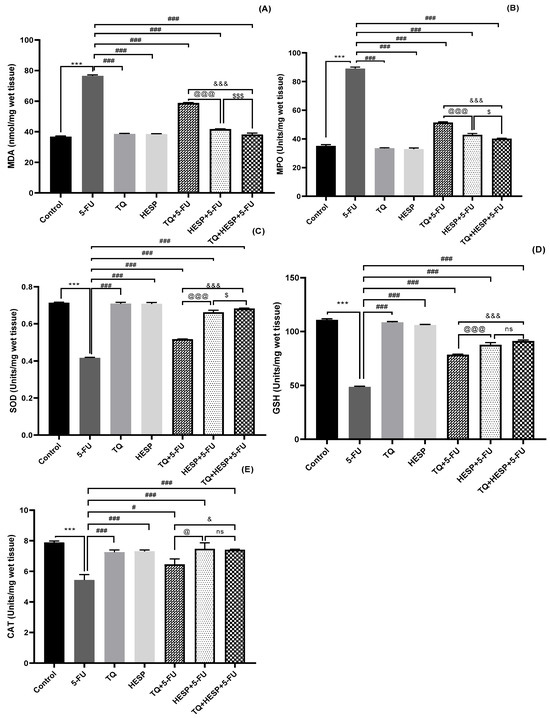 The effect of TQ, HESP, and 5-FU administration on cardiac tissue oxidative stress parameters and comparison of different groups with each other (one-way Anova followed by Tukey-Kramer multiple comparison test). (A) MDA level; (B) MPO level; (C) SOD level; (D) GSH level; (E) CAT level. All results are expressed as the mean ± SD. ns = non-significant; *** p < 0.001 vs. control group; ### p < 0.001, # p < 0.05 vs. 5-FU group; @ p < 0.05, @@@ p < 0.001 vs. TQ+5-FU group; & p < 0.05, &&& p < 0.001 vs. TQ+5-FU group; $ p < 0.05, $$$ p < 0.001 vs. HESP+ 5-FU group.