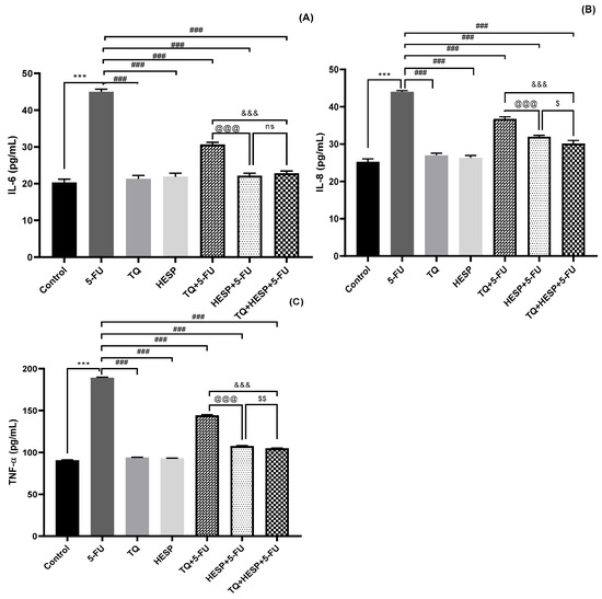 The effect of TQ, HESP, and 5-FU administration on cardiac tissue pro-inflammatory markers and comparison of different groups with each other (one-way Anova followed by Tukey-Kramer multiple comparison test). (A) IL-6 level; (B) IL-8 level; (C) TNF-α level. All results are expressed as the mean ± SD. ns = non-significant; *** p < 0.001 vs. control group; ### p < 0.001 vs. 5-FU group; @@@ p < 0.001 vs. TQ+5-FU group; &&& p < 0.001 vs. TQ+5-FU group; $ p < 0.05, $$ p < 0.01 vs. HESP+ 5-FU group.