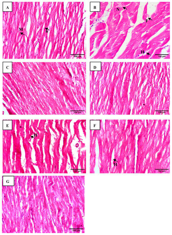 Histopathological findings of cardiac tissues. (A) control group showing normal cardiac muscle architecture with striations and myocardial cell membrane integrity. (B) 5-FU-treated group showing necrosis of muscle fibers with vacuolar changes evident from fragmentation. (C) TQ-treated group showed normal cardiac histology (D) HESP-treated group showed normal histology (E) TQ+5-FU-treated group showing mild hyperemia. (F) HESP+5-FU-treated group showing mild hyperemia. (G) TQ+HESP+5-FU-treated group showed almost normal cardiac muscle architecture. M = myocardial fibers; n = nuclei; H = hyperemia; N = necrosis; F = fragmentation; TQ = Thymoquinone; HESP = Hesperidin; 5-FU = 5-Fluorouracil. (H and E; ×400, scale bar = 100 μm).
