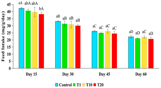 Amount of feed consumed (mg/g body weight/day) by silver barb fingerlings exposed to 0.10 (T1), 1.25 (T10), and 2.19 (T20) ppm of F. The vertical bars show the standard deviations. Bars with different superscript letters a–b show that the means were significantly different among the treatments at the same sampling time (p < 0.05). Bars with different superscript letters A–D show that the means were significantly different at the different sampling times of each treatment (p < 0.05).