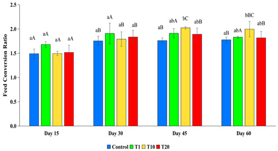 Feed conversion ratio of silver barb fingerlings exposed to 0.10 (T1), 1.25 (T10), and 2.19 (T20) ppm of F. The vertical bars show the standard deviations. Bars with different superscript letters a–b show that the means were significantly different among the treatments at the same sampling time (p < 0.05). Bars with different superscript letters A–C show that the means were significantly different at the different sampling times of each treatment (p < 0.05).