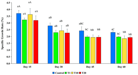 The specific growth rate of silver barb fingerlings exposed to 0.10 (T1), 1.25 (T10), and 2.19 (T20) ppm of F. The vertical bars show the standard deviation. Bars with different superscript letters a–b show that the means were significantly different among the treatments at the same sampling time (p < 0.05). Bars with different superscript letters A–C show that the means were significantly different at the different sampling times of each treatment (p < 0.05).