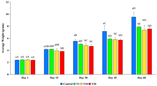 Average weight (g) of silver barb fingerlings exposed to 0.10 (T1), 1.25 (T10), and 2.19 (T20) ppm of F. The vertical bars show the standard deviations. a–b show that the means were significantly different among the treatments at the same sampling time (p < 0.05). A–E show that the means were significantly different at the different sampling times of each treatment (p < 0.05).