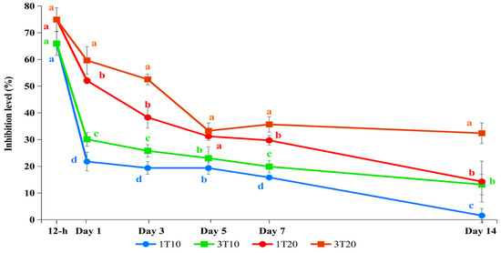 After 9 h, the AChE inhibition levels in T10 and T20 peaked at 73.6% and 79.7%, respectively, while the levels in T1 had decreased to 34.3%. After 72 h, the AChE inhibition levels in all the treatments had decreased to around 30% but were still significantly higher than the control (p < 0.05). After 96 h, the AChE inhibition levels in T1, T10, and T20 were 11.8%, 13.8%, and 30.6%, respectively, and only T20 was significantly higher than the control (p < 0.05).