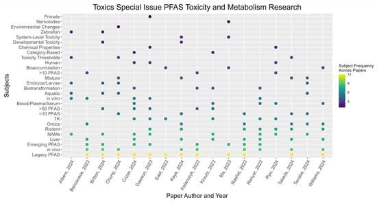 Per- and polyfluoroalkyl substances (PFAS) are nearly ubiquitous and found in rivers, soils, atmosphere, food packaging, clothing, cosmetics, commercial products, homes, drinking water, and humans and other organisms [1]. The high number, variety of chemical properties, and widespread occurrence of PFAS complicates research into additional understanding of environmental and human health impacts. There is strong support from the database of published literature regarding the human health effects after exposure to the well-studied PFAS, perfluorooctanoic acid (PFOA) or perfluorooctanesulfonic acid (PFOS), summarized in the recently finalized United States Environmental Protections Agency (EPA) toxicity assessments [2,3]. Based on the health effects associated with human health, phase outs [4,5,6] and risk reduction [7] have resulted. However, gaps in toxicity data for legacy and emerging PFAS in this structurally diverse class persist. Gaining a better understanding of the potentially toxic effects of PFAS mixtures is also a critical data gap because of co-exposure to multiple diverse PFAS [8]. The Special Issue of Toxics entitled “PFAS Toxicology and Metabolism” expands our knowledge of the environmental and human health effects of PFAS by providing original research and reviews that describe new methods, toxicokinetics, fate and bioaccumulation, metabolism, transport, toxicity, comparative toxicity, and adverse effects of individual PFAS and PFAS mixtures.