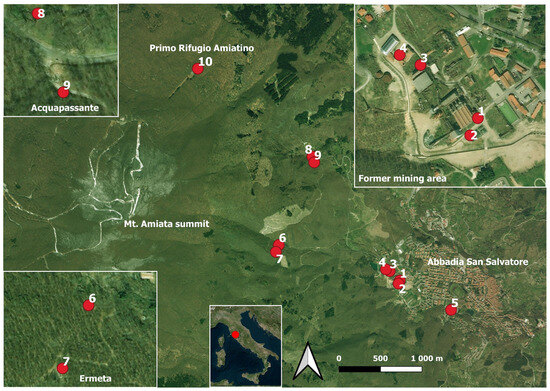 - Rimondi, V.; Chiarantini, L.; Lattanzi, P.; Benvenuti, M.; Beutel, M.; Colica, A.; Ruggieri, G. Metallogeny, Exploitation and Environmental Impact of the Mt. Amiata Mercury Ore District (Southern Tuscany, Italy). Ital. J. Geosci. 2015, 134, 323–336. [Google Scholar] [CrossRef]