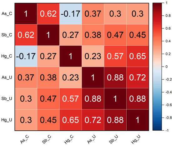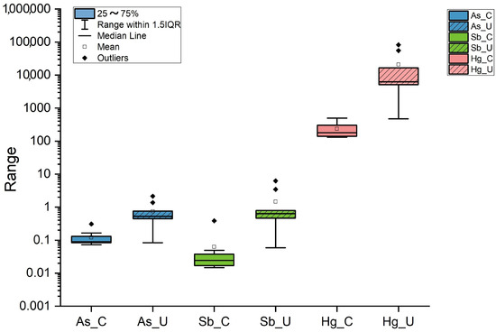 - Arsenic and Sb were analyzed by ICP-MS (Agilent 7500-ce, Agilent, Santa Clara, CA, USA) after Closed-Vessel Acid Digestion of c.a. 0.25 g of dry powder in a microwave oven (CEM MARS Xpress, CEM Corporation, Matthews, NC, United States) using Teflon vessels with 3 mL concentrated HNO3 (ultrapure grade 65%), 2 mL H2O2 (ultrapure 39%) and 5 mL of MilliQ water with HNO3:H2O2 (2:1 ratio) [17]. The reliability and accuracy of As and Sb results were checked by analyzing four certified reference materials (certified leaves: NIST 1515, NCS DC 73,349, NCS DC 73,350, and NCS DC 73,351), and quality control was assessed by comparing obtained results with the certified values. The recovery values, i.e., the difference in percentage between measured and certified values for each element, were around 100 ± 10%. The same technique was also applied to determine the vanadium content that was then used as a reference metal in the calculation of the Hg, As, and Sb Enrichment Factor (EF, i.e., a parameter to evaluate the origin of the elements trapped by the mosses; cf. Section 4).