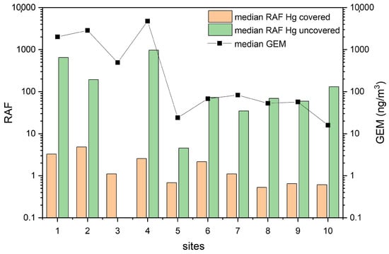 - Hgtot was analyzed with a Hydra-C Mercury Analyzer instrument (Teledyne Instruments Leeman Labs Inc., Hudson, New Hampshire, USA) based on the 7473 U.S. EPA method [44]. This method allows the determination of the Hg content by operating directly on the solid sample, avoiding losses or contamination. Mercury is released from the matrix by thermal decomposition, oxidized and separated from the other components, and subsequently trapped in a gold amalgam from which it is determined. Each sample was analyzed 5 times to verify the analytical reproducibility (SD ranging from 5 to 10%). Median blank values were subtracted from the median values of the samples;