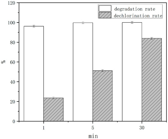 In order to find out the ball milling time required to achieve the complete mineralization of lindane in contaminated soil, we carried out supplementary experiments on the reported literature [28], and the results are shown in Figure 1. The degradation rate of lindane can reflect its chemical bond breaking, and the chloride ion concentration can reflect the mineralization level of lindane to some extent. In the optimal process of sodium hydroxide-enhanced persulfate ball milling for the degradation of lindane in contaminated soil, lindane can reach a 100% degradation rate in 5 min, close to the theoretical calculation time of 378 s for all materials to achieve one full collision. The dechlorination of lindane at 5 min was only 51.5%, and the level of dechlorination at 30 min reached 83.9%, indicating that chlorinated organic matter was still present. The experimental results in Figures 3 and 4 of the literature [28] show that the dechlorination level reached 100% in 2 h. It can be seen that there is a certain gap between the theoretical calculations and experimental results. In addition to the effect of the molecular bond length changes in the second part, the possible reasons are as follows: pollutants in the soil environment, ball milling collision, and oxidative contact chances being relatively small compared to pure chemicals. Other organic matter in the soil environment will also affect the efficiency of lindane degradation, the degradation process cannot be continuous and smooth, which inevitably leads to the waste of ball milling energy, delaying the complete degradation of lindane in the soil time.
