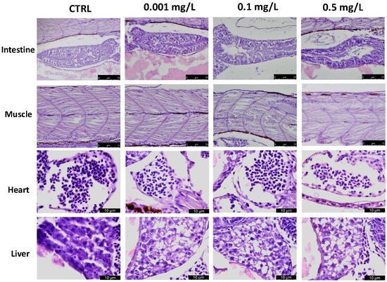 Histopathological changes in the hearts, livers, intestines, and muscles of zebrafish larvae exposed to OXA at 96 hpf. LV = Liver; HE = Heart. Data are presented as means ± SEM or medians with interquartile ranges for non-parametric data of 10 larvae for each group. Scale bars 40× magnification.