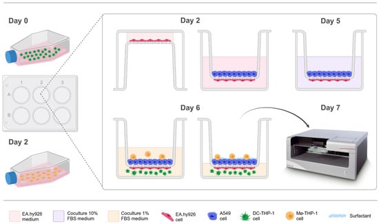On day 2, 6-well cell culture plates (Greiner Bio-One, Vilvoorde, Belgium) were filled with hanging cell culture inserts, provided with a high pore density membrane with a surface area of 4.5 cm2 and 5 μm pore size (cellQART, Sabeu, Northeim, Germany). The plates with inserts were inverted to seed human endothelial cells, EA.hy926 (2.4 × 104 cells/cm2), on the basolateral side of the insert semipermeable membrane. After the cells attached to the membrane, the plate with inserts was returned to its original orientation, and A549 epithelial cells were seeded on the apical side of the cell culture inserts (6 × 104 cells/cm2). Complete EA.hy926 cell culture medium was added to the basolateral compartment, and both epithelial and endothelial cells were cultured to reach confluency over three days at 37 °C and 5% CO2.