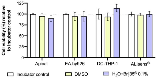 Viability of cells from the apical compartment (A549 and MΦ-THP-1), EA.hy926 and DC-THP-1 cells and ALIsens® following exposure to pure DMSO and sterile water containing 0.1% Brij® 35, relative to the incubator control. Data are expressed as mean ± SD of n = 1, N = 3. p values (>0.05) were determined by one-way ANOVA, Dunnett’s post-hoc.