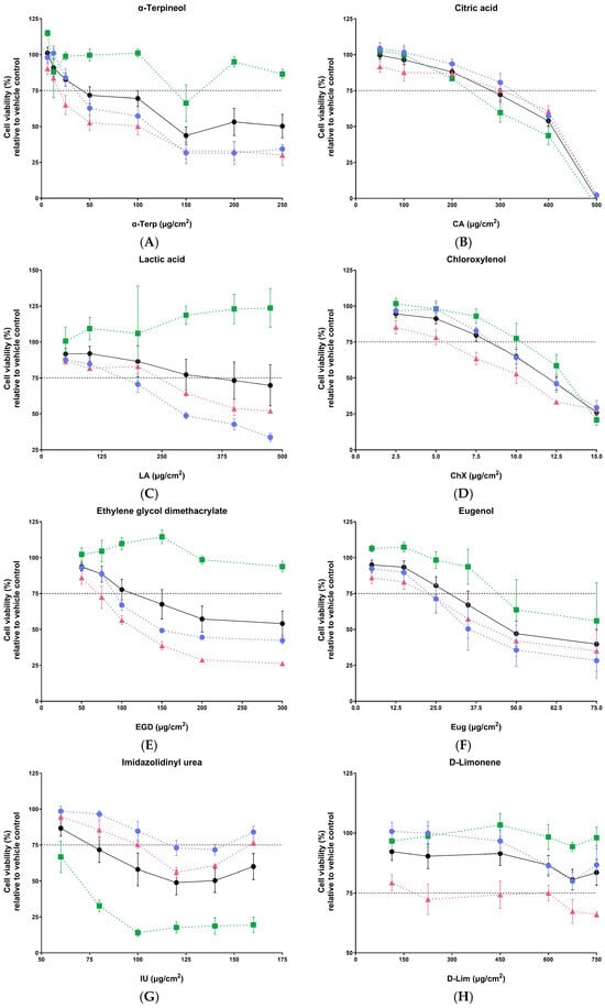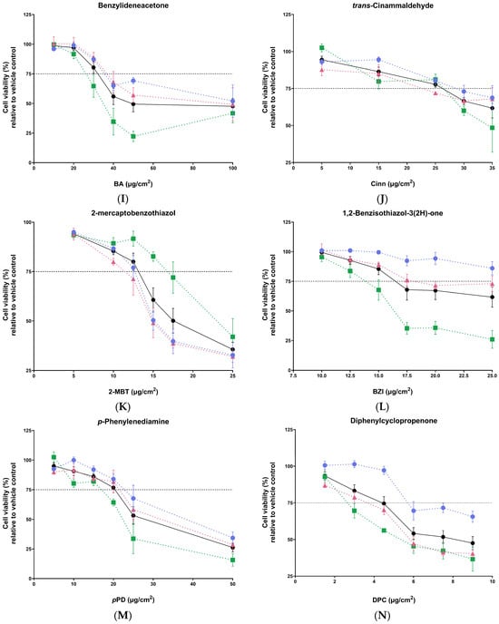 Viability of ALIsens® (black hexagons and line), A549 and MΦ-THP-1 cells (blue circles and dotted line), EA.hy926 cells (pink triangles and dotted line) and DC-THP-1 cells (green squares and dotted line) relative to the corresponding vehicle control following 24 h exposure to the investigated chemicals (A) α-terpineol, (B) citric acid, (C) lactic acid, (D) chloroxylenol, (E) ethylene glycol dimethacrylate, (F) eugenol, (G) imidazolidynil urea, (H) D-limonene, (I) benzylideneacetone, (J) trans-cinnamaldehyde, (K) 2-mercaptobenzothiazol, (L) 1,2-benzisothiazol-3(2H)-one, (M) p-phenylenediamine, (N) diphenylcyclopropenone. Data are expressed as mean ± SEM of n = 1, N ≥ 3.