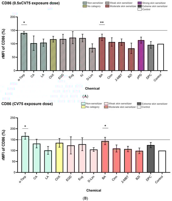 Expression of CD86 marker measured on the surface of DC-THP-1 cells following exposure of ALIsens® for 24 h to (A) 0.5× CV75 dose and (B) CV75 dose of the evaluated chemicals, assessed by flow cytometry. Data are expressed as mean ± SD of n = 1, of N = 3 (α-Terp, CA, ChX, IU, D-Lim, DPC), N = 4 (LA, EGD, Eug, Cinn, 2-MBT, pPD), N = 5 (BZI); N = 6 (BA) for the 0.5× CV75 exposure dose and of N = 3 (α-Terp, CA, ChX, D-Lim, BA, DPC), N = 4 (LA, EGD, Eug, Cinn, 2-MBT, BZI) for the CV75 exposure dose. p values were determined by one-sample t-test. p ≤ 0.05 = *, p ≤ 0.01 = **.