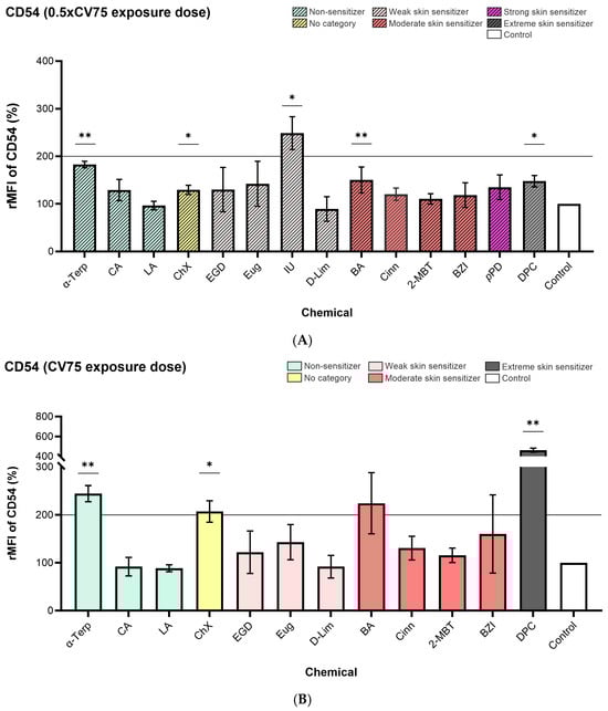 Expression of CD54 marker measured on the surface of DC-THP-1 cells following exposure of ALIsens® for 24 h to (A) 0.5× CV75 and (B) CV75 of the evaluated chemicals, assessed by flow cytometry. Data are expressed as mean ± SD of n = 1, of N = 3 (α-Terp, CA, ChX, IU, D-Lim, DPC), N = 4 (LA, EGD, Eug, Cinn, 2-MBT, pPD), N = 5 (B ZI); N = 6 (BA) for the 0.5× CV75 exposure dose and of N = 3 (α-Terp, CA, ChX, D-Lim, BA, DPC), N = 4 (LA, EGD, Eug, Cinn, 2-MBT, BZI) for the CV75 exposure dose. p values were determined by one-sample t-test. p ≤ 0.05 = *, p ≤ 0.01 = **.