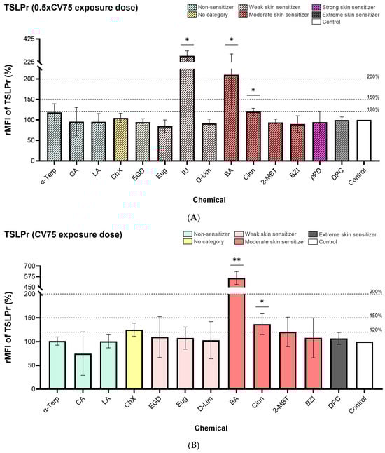 Expression of TSLPr marker measured on the surface of DC-THP-1 cells following exposure of ALIsens® for 24 h to (A) 0.5× CV75 and (B) CV75 of the evaluated chemicals, assessed by flow cytometry. Data are expressed as mean ± SD of n = 1, of N = 3 (α-Terp, CA, ChX, IU, D-Lim, DPC), N = 4 (LA, EGD, Eug, Cinn, 2-MBT, pPD), N = 5 (BZI); N = 6 (BA) for the 0.5× CV75 exposure dose and of N = 3 (α-Terp, CA, ChX, D-Lim, BA, BZI, DPC), N = 4 (LA, EGD, Eug, Cinn, 2-MBT) for the CV75 exposure dose. p values were determined by one-sample t-test. p ≤ 0.05 = *, p ≤ 0.01 = **.
