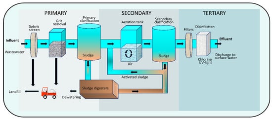 The tertiary treatment process involves the application of disinfectants, with chlorine being the most widely used disinfectant [21]. Although chlorine is considered the most significant breakthrough in the water-treatment process, researchers worldwide have recently focused on the disinfection by-products (DBPs) generated by chlorine to explore alternative disinfectants [21]. The schematic outline of the WWTPs arrangement can be better understood from Figure 1.