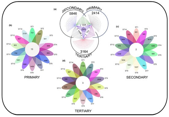 Venn diagram of obtained ASVs. (a) Cumulative ASVs shared and unique in different treatment stages (primary, secondary, and tertiary); (b) shared and unique ASVs between wastewater samples obtained from the primary treatment stage; (c) shared and unique ASVs between wastewater samples obtained from the secondary treatment stage; (d) shared and unique ASVs between wastewater samples obtained from the tertiary treatment stage.