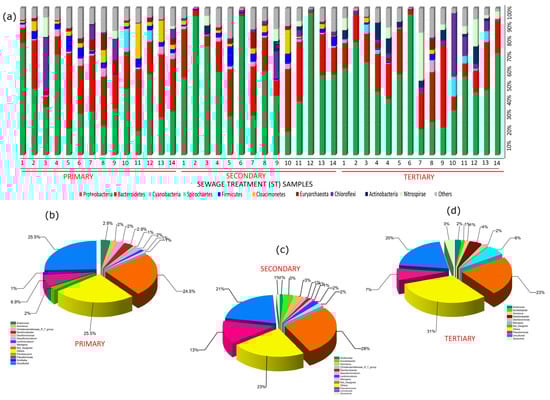 Composition and structure of bacterial diversity in different treatment stages (primary, secondary, and tertiary) (a) at phylum level (data representing top 10% abundant phyla); Pie chart showing genus abundance in (b) primary; (c) secondary; (d) tertiary (data representing top 20% abundant genera, low-abundance genera are included under the heading “Others”).
