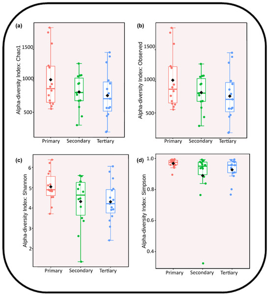 Box-plot showing alpha diversity species richness and evenness indices on raw data in different treatment groups, namely, primary, secondary, and tertiary: (a) Chao1; (b) Observed; (c) Shannon; (d) Simpson.