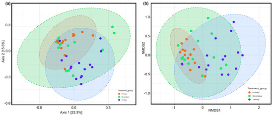 The NMDS plot (F value: 2.759, R2: 0.12, p value < 0.05, NMDS stress: 0.13175) at the genera level confirmed the results observed in the PCoA ordination plots (Figure 5b). The majority of the wastewater samples from the primary treatment group clustered together at low confidence intervals, while only a few samples from the secondary and tertiary treatment groups significantly overlapped. Furthermore, the clustering of the majority of the wastewater samples from the secondary and tertiary treatment groups revealed a relatively higher degree of similarity in the structures of the bacterial communities.