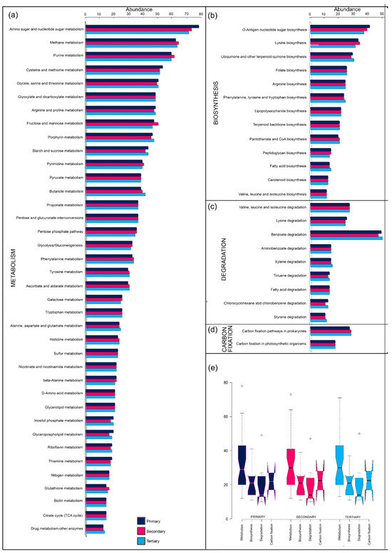 Bacterial functional annotations using PICRUSt2 analysis in different treatment stages, namely, primary, secondary, and tertiary: (a) Functional category (Metabolic pathways) based at Functional level 2. (b) Functional category (Biosynthetic pathways) based at Functional level 2. (c) Functional category (Degradation pathways) based at Functional level 2. (d) Functional category (Carbon fixation) based at Functional level 2. (e) Functional categories based on KEGG at Functional level 1.