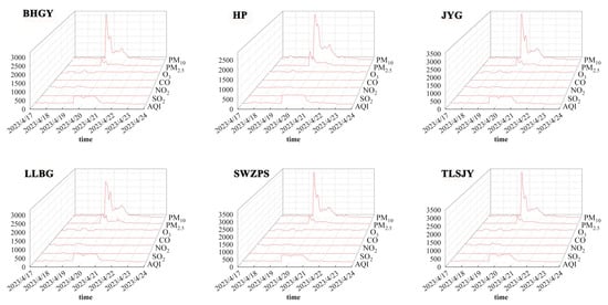 Temporal variation in pollutants (PM10 [µg/m3], PM2.5 [µg/m3], CO [mg/m3], O3 [µg/m3], SO2 [µg/m3], NO2 [µg/m3]) at six monitoring stations in Lanzhou (LLBG: Lan Lian Bin Guan; JYG: Jiao Yu Gang; BHGY: Bai He Gong Yuan; TLSJY: Tie Lu She Ji Yuan; SWZPS: Sheng Wu Zhi Pin Suo; HP: He Ping) from 17 to 23 April 2023.