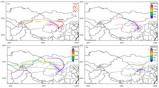Figure 4 illustrates the backward trajectories of atmospheric pollutants from 17 to 23 April. Overall, as shown in Figure 4a and Table 3, the backward trajectory clustering of the atmospheric pollutants during this period can be divided into three groups, with 14, 9, and 5 trajectories in each cluster, respectively. Cluster 1 contains the most trajectories, while Cluster 2 exhibits higher average concentrations of PM2.5 and PM10. Collectively, Clusters 1 and 2, with their higher trajectory counts and particulate concentrations, represent the primary sources of dust for this storm. The main pathways of these dust particles include central and western Mongolia, northern Ningxia, the five Central Asian countries (Kazakhstan, Kyrgyzstan, Tajikistan, Uzbekistan, and Turkmenistan), the Junggar Basin, and the border regions between Gansu and Inner Mongolia.