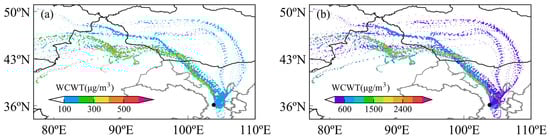 Concentration-weighted trajectory (CWT) analysis of PM2.5 and PM10 during 19–21 April 2023: (a) PM2.5 contribution from source regions and (b) PM10 contribution from source regions. Black dots in the figure represent the location of Lanzhou City.