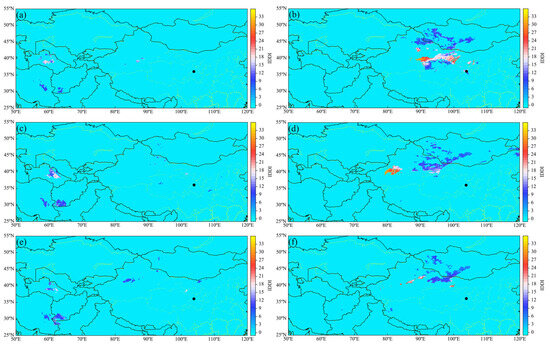 Sand and dust distribution maps from the night of the 19th to the 21st (a,c,e) and during the day (b,d,f). Black dots in the figure represent the location of Lanzhou City.