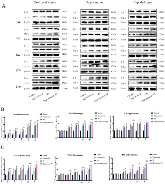 To identify the inflammatory status along with Pb treatment, the protein expression of proinflammatory cytokines (IL-6 and TNF-α) in hypertensive mice after Pb exposure was detected in prefrontal cortex (PFC), hippocampus, and the hypothalamus of mice with/without hypertension and Pb exposure for 2 w, 4 w, 8 w, 12 w, and 24 w. The protein expression of IL-6 in the PFC of hypertensive or Pb-exposed mice gradually increased from 4 w and seemly peaked at 12 w exposure. Moreover, the IL-6 protein expression in the PFC of mice in the Pb + hypertension group heighted at 2 w exposure and reached to fourfold that of control group at 12 w exposure. Certainly, IL-6 expression in the hippocampus and hypothalamus enhanced from that at 4 w exposure in mice with hypertension or Pb exposure. In addition, hypertension resulted in higher TNF-α protein expression in the PFC, hippocampus, and hypothalamus of mice at 4 w, 8 w, and 12 w exposure, respectively. Moreover, Pb-exposed mice began to show higher TNF-α protein expression at 2 w exposure in the PFC and at 8 w exposure in the hippocampus and hypothalamus. As for the hypertensive mice with Pb exposure, TNF-α protein expression increased in the PFC, hippocampus, and hypothalamus at 2 w or 4 w exposure, respectively. Take together, hypertension could exacerbate the increase in IL-6 protein expression in the PFC of mice as early as 2 w into Pb exposure compared with that in the hippocampus or hypothalamus. In addition, hypertension significantly enhanced the expression of TNF-α of mice in the PFC, hippocampus, and hypothalamus after 12 w Pb exposure (Figure 1A–C).