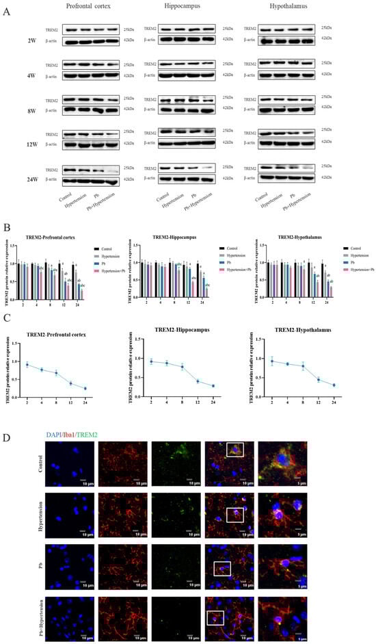 Studies have revealed that TREM2 plays pivotal roles in regulating microglia-mediated neuroinflammation. To clarify the role of TREM2 expression herein, the atlas of changes in TREM2 protein expression was investigated in hypertension mice with Pb exposure. In the PFC, TREM2 protein expression of hypertensive and Pb-exposed mice decreased significantly from 12 w and 8 w exposure, respectively. Notably, hypertensive mice with Pb exposure had a lower expression of the TREM2 protein compared to the mice of hypertension or Pb alone from 4 w exposure and seemingly decreased significantly at 12 w exposure in which the protein expression of TREM2 was 38.4% that of control group. In the hippocampus and hypothalamus, TREM2 protein expression in the hypertensive mice and Pb-exposed mice descended from 24 w and 12 w exposure respectively, and the co-exposed mice began to reduce at 8 w treatment (Figure 2A,B). Essentially, the TREM2 protein expression reduced in hypertensive mice following Pb exposure. Moreover, the TREM2 protein expression of the co-exposed group decreased earlier than in the single-exposure groups and firstly appeared in the PFC. In addition to hypertension potentially exacerbating the decline of TREM2 in mice after Pb exposure, the TREM2 protein expression following co-exposure to hypertension and Pb showed the most significant decline speed at 12 w exposure in the PFC, hippocampus, and hypothalamus compared to that at other exposure time points (Figure 2C).