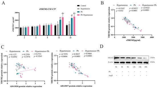 It is reported that TREM2 can be sheared to sTREM2 by ADAM10 and ADAM17 [19], which might be one reason of decreased TREM2 in hypertensive mice with Pb exposure. Herein, we detected sTREM2 expression in the CSF of hypertensive mice with/without Pb exposure. The sTREM2 level in the CSF of the hypertension group, Pb group, and Pb + hypertension group significantly increased at 12 w and 24 w exposure, especially in the Pb + hypertension group (Figure 5A). However, the change in sTREM2 in the CSF lagged behind the change in TREM2 expression (Figure 2A and Figure 5A). Meanwhile, there was a strong negative correlation between CSF sTREM2 and TREM2 protein expression in the animal model (Figure 5B). Those data indicated that proteolytic enzyme (ADAM10/17) might be involved in TREM2 decline.