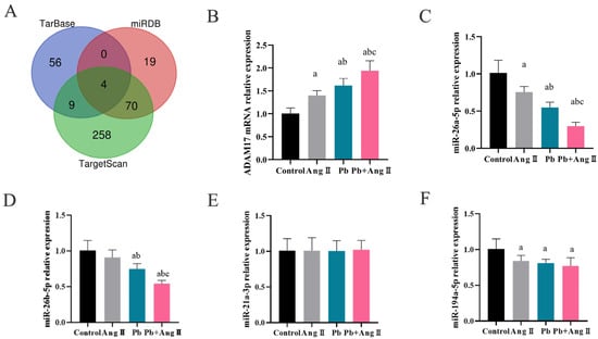 ADAM10 and ADAM17 can be regulated by miRNAs. MiR-365 could inhibit the migration of triple-negative breast cancer by targeting ADAM10 [14]. Studies have revealed that miR-449a could regulate the invasion of human non-small-cell lung carcinoma by targeting ADAM10 [15]. MiR-26a-5p could alleviate cardiac hypertrophy and dysfunction via targeting ADAM17 [16]. In addition, miR-145 alleviated sepsis-induced inflammatory responses and organ injury by targeting ADAM17 [17]. Nevertheless, miRNAs that can regulate ADAM10 or ADAM17 are still unknown in hypertensive mice after Pb exposure. Moreover, TarBase (version 9.0), miRDB (release 5.0), and TargetScan (version 8.0) are the effective tools to screen miRNAs that may regulate ADAM10 or ADAM17 in hypertensive mice with Pb exposure.