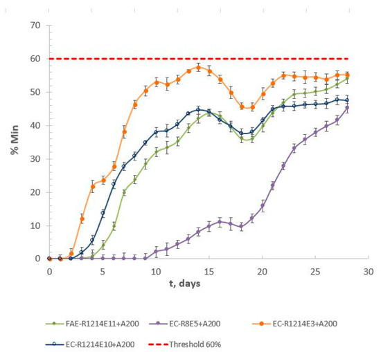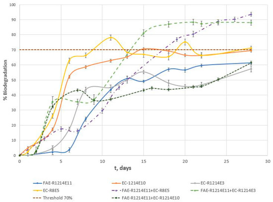 To compare and quantify the biodegradation test, two key parameters of the biodegradation profiles [22] were defined and analysed: (a) Half-life (t1/2) is the time required for the substrate concentration to decrease by 50% from the start of the biodegradation process. This value is determined using graphical methods based on the biodegradation curve. (b) Surfactant biodegradability (B) is defined as the percentage of surfactant that is biodegraded after 50 h of assay. Half-time and surfactant biodegradability results are shown in Table 5, together with mineralization values obtained using Equation (11).
