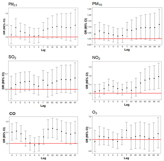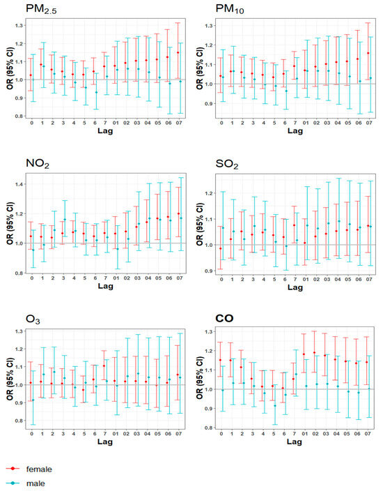 As shown in Figure 2, the results for females were similar to those for the whole population. PM2.5 was significant at lag1, lag7, and lag07 day. PM10 was statistically significant at lag7 and lag07 day. NO2 was statistically significant at lag4 and lag04–07 day. SO2 and O3 were significant at lag7 day. CO was significant at lag0–2 and lag01–07 day. On the contrary, the correlations in males were insignificant. NO2 was statistically significant only at lag3 day, with an OR of 1.16 (95% CI: 1.04,1.29) (see Supplementary Table S3).