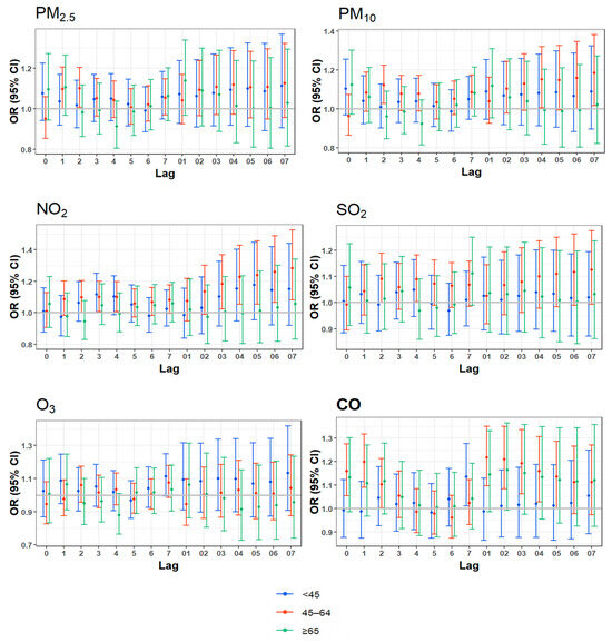 As shown in Figure 3, in the younger group (<45 years old), only CO showed a positive correlation at lag7 day with an OR of 1.14 (95% CI: 1.01, 1.28). In the middle-aged group (45–64 years old), significant correlations were observed at lag2 day for PM2.5; at lag2, lag7, lag04, and lag07 day for PM10; at lag2 and lag4 day for SO2; at lag2–4 and lag03–07 day for NO2; and at lag0–2 and lag01–05 day for CO, respectively. In the older group (≥65 years old), none of the air pollutants showed statistical significance (see Supplementary Table S5).