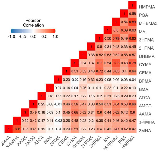 Correlation matrix for urinary VOC metabolites (ln-transformed, μg/g Cr). Notes: CEMA, N-acetyl-S-(2-carboxyethyl)-L-cysteine; HMPMA, N-acetyl-S-(3-hydroxypropyl-1-methyl)-L-cysteine; MHBMA3, N-acetyl-S-(4-hydroxy-2-butenyl)-L-cysteine; CYMA, N-acetyl-S-(2-cyanoethyl)-L-cysteine; AMCC, N-acetyl-S-(N-methylcarbamoyl)-L-cysteine; 2HPMA, N-acetyl-S-(2-hydroxypropyl)-L-cysteine; 2MHA, 2-methylhippuric acid; 3HPMA, N-acetyl-S-(3-hydroxypropyl)-L-cysteine; 3-4MHA, 3- and 4-methylhippuric acid; AAMA, N-acetyl-S-(2-carbamoylethyl)-L-cysteine; ATCA, 2-aminothiazoline-4-carboxylic acid; BPMA, N-acetyl-S-(n-propyl)-L-cysteine; DHBMA, N-acetyl-S-(3,4-dihydroxybutyl)-L-cysteine; MA, mandelic acid; BMA, N-acetyl-S-(benzyl)-L-cysteine; and PGA, phenylglyoxylic acid.
