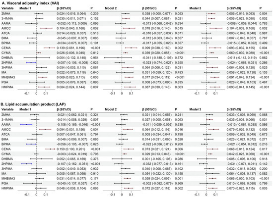Sensitivity analyses further employed RCS models to flexibly fit and visualize linear and nonlinear relationships between mVOCs and the VAI or the LAP. As shown in Figures S2 and S3, the RCS showed broadly similar results to the weighted generalized linear models. Consistently, we observed that AMCC, CEMA, CYMA, 3HPMA, MHBMA3, and HMPMA were positively correlated with the VAI (p for overall < 0.05 for all, p for nonlinear > 0.05 except for AMCC) and that AMCC, CYMA, and MHBMA3 were positively correlated with the LAP (p for overall < 0.05, p for nonlinear > 0.05). The results also revealed nonlinear correlations of AAMA, ATCA, 2HPMA, and PGA with the VAI or the LAP (p for nonlinear < 0.05), as well as a significant overall negative trend for 2HPMA and PGA (p for overall < 0.05).