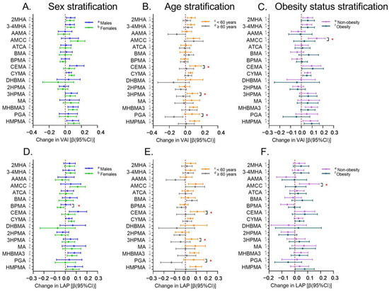 Estimated effects of urinary mVOCs on VAI and LAP grouped by sex (A for VAI, D for LAP), age (B for VAI, E for LAP), and obesity status (C for VAI, F for LAP) based on interaction models. Notes: *, p for interaction < 0.05; obesity status was categorized as non-obesity (BMI < 30 kg/m2) and obesity (BMI ≥ 30 kg/m2).