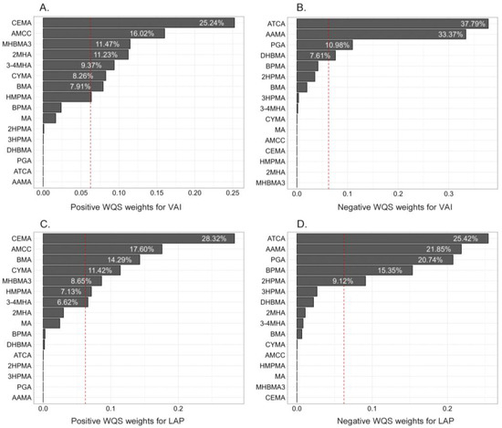 Weights for urinary mVOCs associated with the VAI and LAP from the weighted quantile sum (WQS) regression model: (A) positive weights for the VAI, (B) negative weights of the VAI, (C) positive weights for the LAP, (D) negative weights for the LAP. The red dashed line is the weight threshold for determining the importance of an element, which was set as the inverse of the number of elements in the mixture (i.e., 1/16).