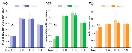 Figure 2. Growth performance of broiler chicken under the water-additive regimens of hypochlorous acid and the control. Average daily gain (ADG, n = 6), average daily feed intake (ADFI, n = 6), and feed conversion ratio (FCR, n = 6) (one-way ANOVA. * means p ≤ 0.05. ** means p ≤ 0.01.).