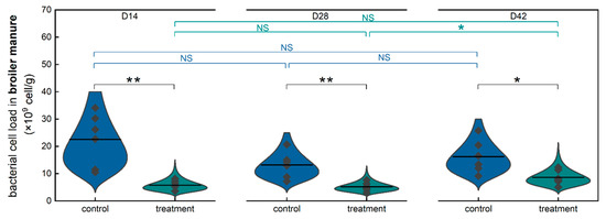 Figure 3. Comparative analysis of bacterial cell load of fresh broiler manure in control group and treatment group. (One-way ANOVA. * means p ≤ 0.05. ** means p ≤ 0.01. NS means no significance. D14, D28, and D42 mean day 14, day 28, and day 42, respectively. n = 6.).