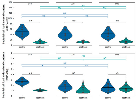 Figure 4. Comparative analysis of bacterial cell load of broiler cecal contents and duodenal contents in control group and treatment group. (One-way ANOVA. * means p ≤ 0.05. ** means p ≤ 0.01. NS means no significance. D14, D28, and D42 mean day 14, day 28, and day 42, respectively. n = 6.).