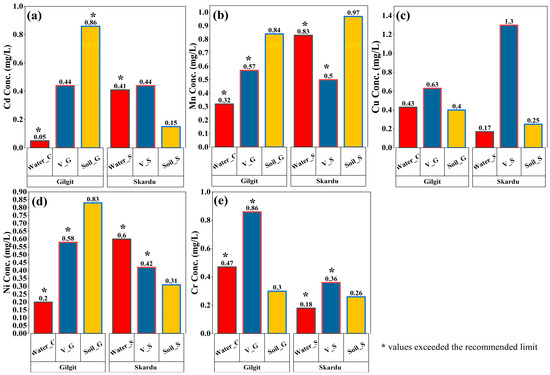 Average distribution of heavy metals in samples across the districts. (a) Concentration of Cd in the drinking water, vegetable, and soil samples. The level of Cd exceeded the permissible level set by the FAO/USEPA (0.003 mg/L) and NSDWQ-PAK (0.01 mg/L) in drinking water. (b) Concentration of Mn in various samples. The Mn concentrations exceeded the allowable limit set by the WHO and USEPA in both districts in water (0.2 mg/L) and vegetables (0.06 mg/kg). (c) The distribution of Cu in various samples was noticeably different at p < 0.05. The highest contamination was recorded for the vegetable sample in Skardu, followed by vegetables in Gilgit. The current results are within the allowable limit for Cu set by the WHO and USEPA. (d) Distribution of Ni in drinking water, vegetables, and soil samples. The Ni average values are 0.2 mg/L and 0.60 mg/L in water samples, which exceeded the permissible limits in water and vegetables (0.07 mg/L, 0.2 mg/kg). (e) Levels of Cr in drinking water, vegetable, and soil samples. Cr observed as 0.47 mg/L and 0.18 mg/L in drinking water samples exceeded the safe limit in both regions, the highest Cr was observed in vegetable samples from the Gilgit region.