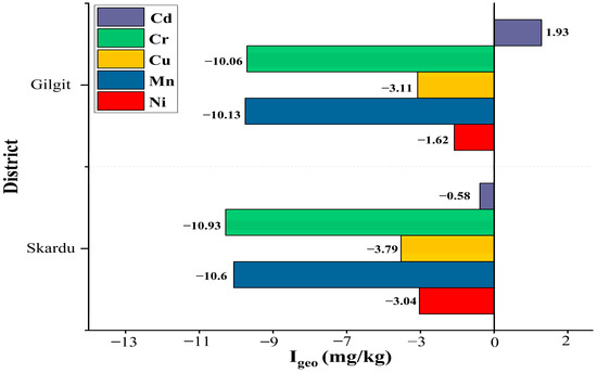 Geo-accumulation index of soil; a positive value was observed for Cd (1.93 mg/kg) from Gilgit, while all other elements show negative values for soil contamination.