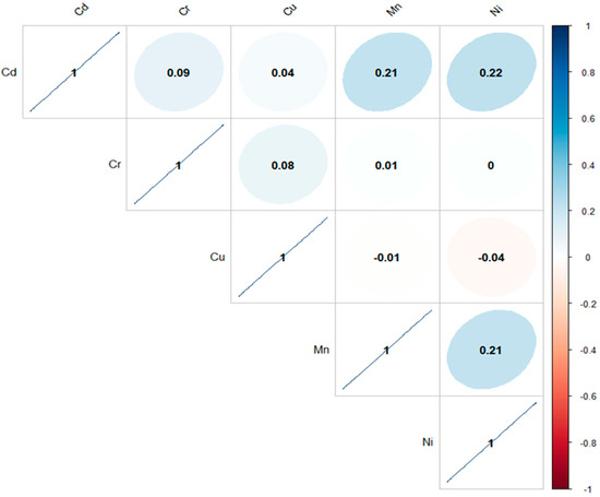 Correlation coefficient matrix of toxic metals; a dark blue color shows strong positive relations among metals, and a dark red color shows significant (p < 0.05) negative relations, while a white color shows neutral relations.