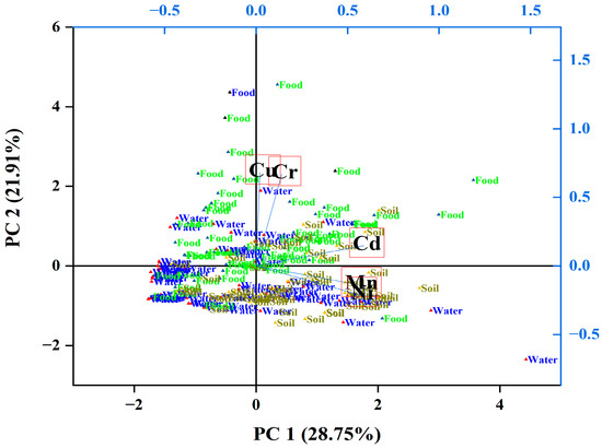 Principle component analysis was performed to determine the hypothetical sources of heavy metals (natural or human) in the drinking water, vegetables, and soil by following the standard protocol [86,87] shown in Figure 5. The PCA was obtained, and its variance was demonstrated by 28.75% and 21.91% for the current study. Generally, PCA exposed two major components of five toxic metals examined in drinking water, vegetables, and soil. PCA1 was highly coevolved with Cd, Cu, Cr, Ni, and Mn, while PCA 2 was substantially coevolved with Mn and Ni (Table S5). The sources of PC1 and PC2, particularly manufacturing pollutants and the farming operations across the research area, might be viewed as mixed sources of human input. Burning fuel and coal generates vehicle emissions and environmental reserves, and it is thought that, in mountainous areas, metals have been gathered in these samples. According to PCA, the strength of identical toxic metals in drinking water, vegetables, and soil varies, because plants absorb and release these elements into the atmosphere.